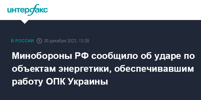 "29 декабря Вооруженными силами Российской Федерации нанесен массированный удар высокоточным оружием большой дальности воздушного и морского базирования по системе военного управления и объектам энергетики, обеспечивавшим работу предприятий оборонно-промышленного комплекса Украины", - сообщил официальный представитель Минобороны РФ Игорь Конашенков на брифинге в пятницу.