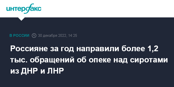 Москва. 30 декабря. INTERFAX.RU - Россияне в 2022 году направили в аппарат уполномоченного при президенте РФ по правам ребёнка 1221 обращение об оформлении опекунства над сиротами из Донецкой и Луганской народных республик, сообщила в пятницу детский омбудсмен Мария Львова-Белова.