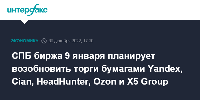 СПБ биржа 9 января планирует возобновить торги бумагами Yandex, Cian, HeadHunter, Ozon и X5 Group