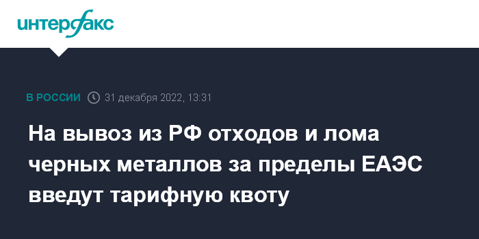 Москва. 31 декабря. INTERFAX.RU - Россия вводит на шесть месяцев тарифную квоту на вывоз отходов и лома черных металлов в государства, не являющиеся членами Евразийского экономического союза, и меняет ставки вывозных таможенных пошлин на товары, вывозимые за пределы таможенной территории ЕАЭС.