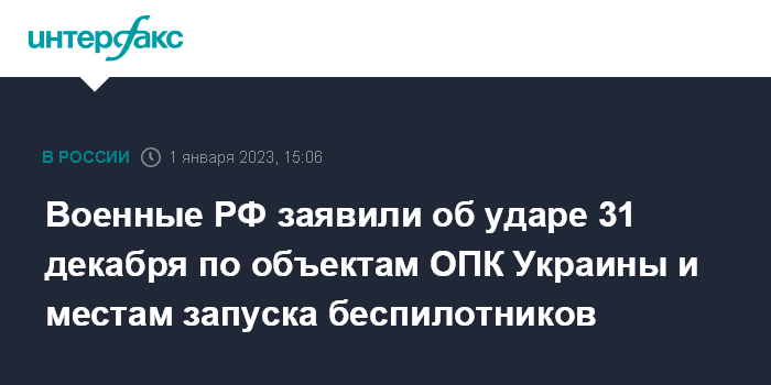 Военные РФ заявили об ударе 31 декабря по объектам ОПК Украины и местам запуска беспилотников