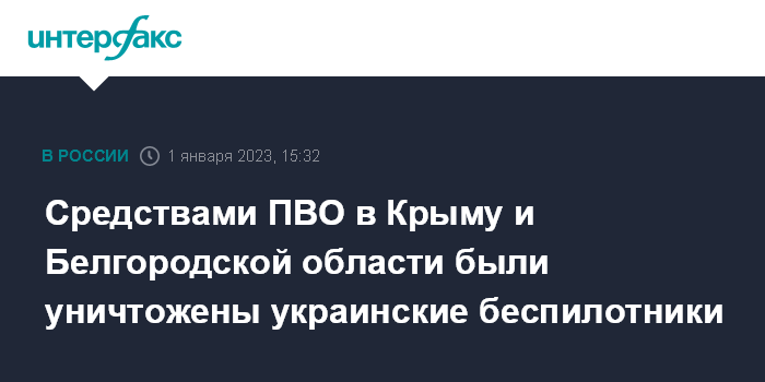 Москва. 1 января. INTERFAX.RU - Российские военные сообщили об уничтожении 15 украинских беспилотников, в частности, в районе Джанкоя (Крым) и Цаповки (Белгородская область), сообщил официальный представитель Минобороны РФ Игорь Конашенков в воскресенье.