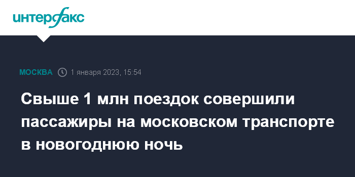 Москва. 1 января. INTERFAX.RU - Москвичи в новогоднюю ночь воспользовались городским транспортом более 1 миллиона раз, сообщили в департаменте транспорта столицы.