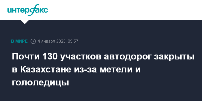 Астана. 4 января. INTERFAX.RU - В Казахстане из-за ухудшения погодных условий закрыты 127 участков автодорог республиканского и областного значения, сообщило в среду МЧС республики.