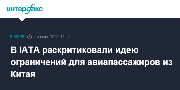 Москва. 4 января. INTERFAX.RU - В Международной ассоциации воздушного транспорта (IАТА) выступили против инициатив ряда стран по введению ограничений для авиапассажиров из Китая в связи со вспышкой COVID-19.
