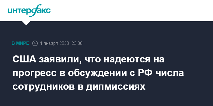 Москва. 4 января. INTERFAX.RU - США надеются, что Москве и Вашингтону удастся достигнуть прогресса по вопросу о числе сотрудников в дипмиссиях, сообщили в среду в госдепе.