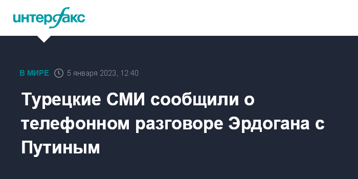 Москва. 5 января. INTERFAX.RU - Президент Турции Реджеп Тайип Эрдоган обсудил в телефонном разговоре с российским президентом Владимиром Путиным отношения между двумя странами, проблемы энергетики, а также ряд региональных проблем, информирует в четверг турецкая пресса.