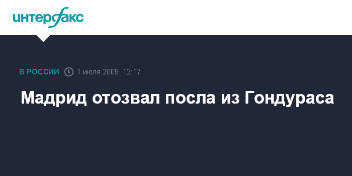 Москва. 1 июля. INTERFAX.RU – Испания отзывает посла из Гондураса "для консультаций", сообщает МИД Испании. Эта мера предпринята в ответ на "государственный переворот", в ходе которого от власти был отстранен законно избранный президент страны Мануэль Селайя.