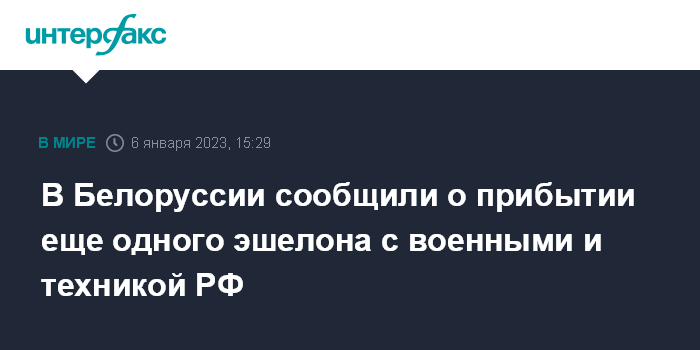Москва. 6 января. INTERFAX.RU - Минобороны Белоруссии в пятницу сообщило о прибытии в республику очередного эшелона с российскими военнослужащими и военной техникой, входящими в состав региональной группировки войск (сил).