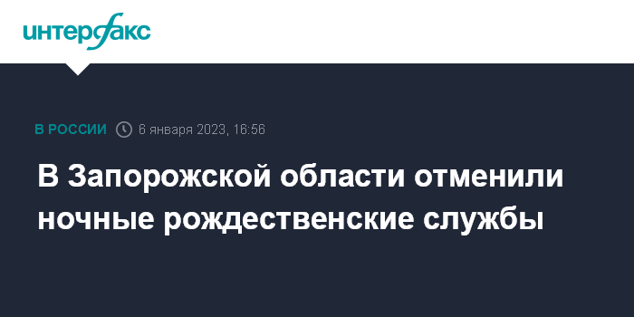 Москва. 6 января. INTERFAX.RU - Ночные рождественские церковные богослужения отменены в храмах Запорожской области из-за военного положения, сообщил в пятницу врио губернатора Евгений Балицкий.