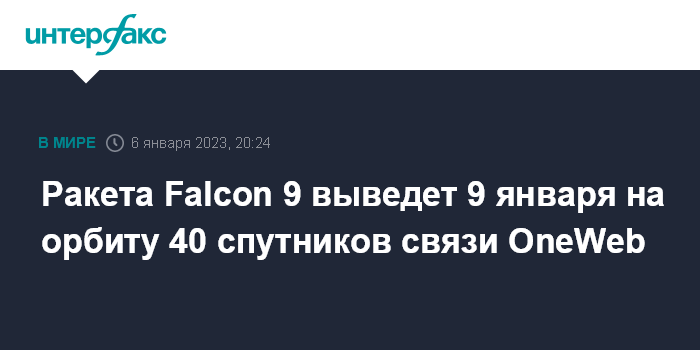 Москва. 6 января. INTERFAX.RU - Ракета-носитель Falcon 9 американской компании SpaceX в понедельник по московскому времени должна вывести на орбиту группу из 40 британских спутников связи OneWeb, сообщила британская компания в пятницу.
