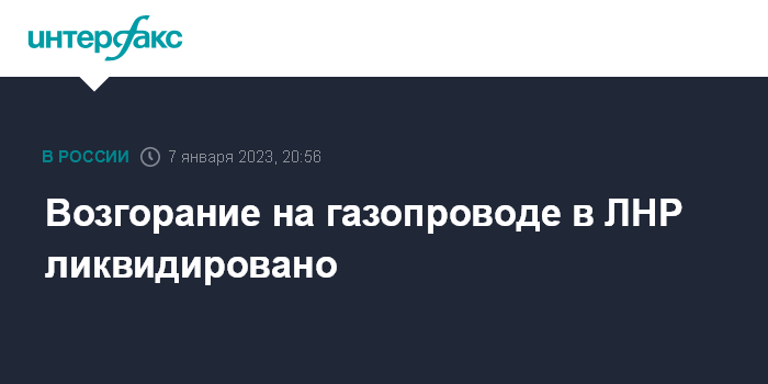 Москва. 7 января. INTERFAX.RU - Возгорание, возникшее в результате взрыва на магистральном газопроводе в городе Лутугино в Луганской народной республике, ликвидировано, сообщили в пресс-службе государственного унитарного предприятия (ГУП) ЛНР "Луганскгаз".