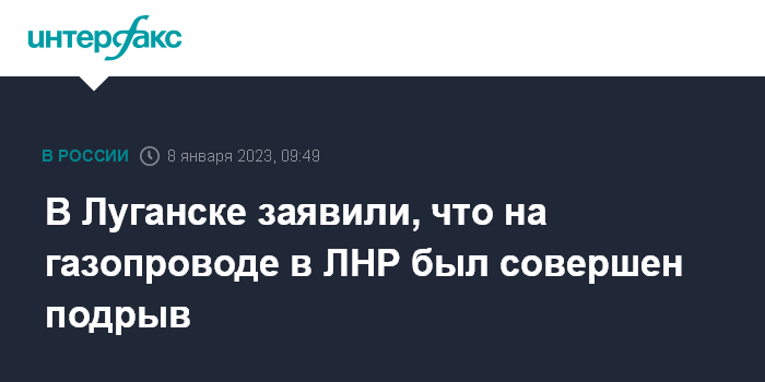 Москва. 8 января. INTERFAX.RU - Взрыв на магистральном газопроводе в городе Лутугино Луганской народной республики произошел, по предварительной информации, в результате целенаправленного подрыва, сообщили в пресс-службе МЧС ЛНР.