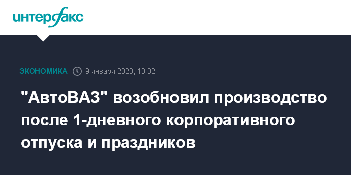 Москва. 9 января. INTERFAX.RU - "АвтоВАЗ" возобновил производство после приостановки с 30 декабря на период однодневного корпоративного отпуска и новогодних праздников, сообщил "Интерфаксу" председатель первичной профсоюзной организации компании Сергей Зайцев.
