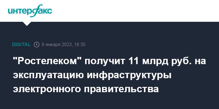 Москва. 9 января. INTERFAX.RU - Минцифры РФ заключило с ПАО "Ростелеком" госконтракт на эксплуатацию инфраструктуры электронного правительства (ИЭП) в 2023-2024 годах на сумму 11,1 млрд рублей, говорится в материалах на сайте госзакупок.
