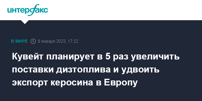 Москва. 9 января. INTERFAX.RU - Кувейт планирует увеличить экспорт дизельного топлива и авиакеросина в Европу в 2023 году, чтобы немного помочь континенту справиться с падением поставок из России, пишет агентство Bloomberg.