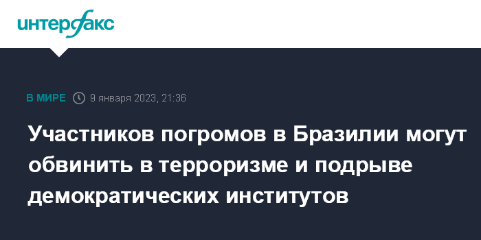 Москва. 9 января. INTERFAX.RU - Прокуратура Бразилии намерена выдвинуть обвинения в совершении преступлений по статьям о подрыве демократических институтов и о терроризме в отношении сторонников экс-президента страны Жаира Болсонару, задержанных при ликвидации стихийного лагеря в столице страны.