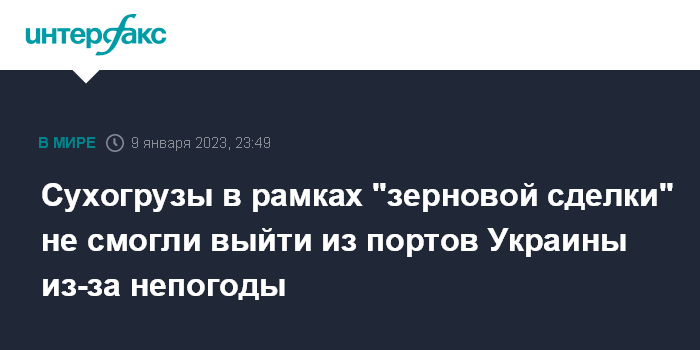 Москва. 9 января. INTERFAX.RU - Совместный координационный центр (СКЦ) сообщил, что из-за неблагоприятных погодных условий суда не смогли в течение понедельника выйти из украинских портов.