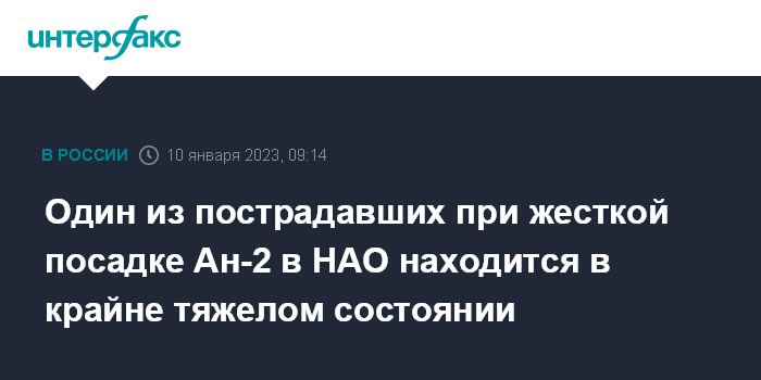 Москва. 10 января. INTERFAX.RU - Один из пострадавших при жесткой посадке самолета Ан-2 в Ненецком автономном округе (НАО) находится в крайне тяжелом состоянии, еще двое - в тяжелом, четверо - в состоянии средней степени тяжести, сообщила пресс-служба Минздрава России.