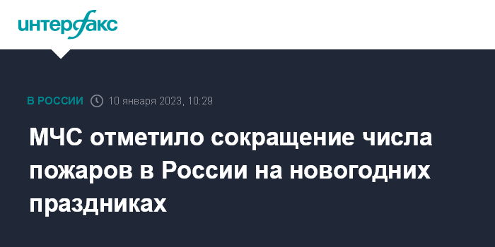 Москва. 10 января. INTERFAX.RU - С 1 по 8 января 2023 года в России случилось почти на 10% меньше пожаров, чем в те же дни 2022 года, сообщили в МЧС России.