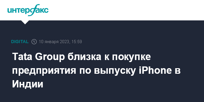 Москва. 10 января. INTERFAX.RU - Индийский многопрофильный конгломерат Tata Group ведет переговоры с тайваньской Wistron Corp. о покупке ее предприятия по выпуску iPhone на юге Индии, сообщает Bloomberg со ссылкой на источники.