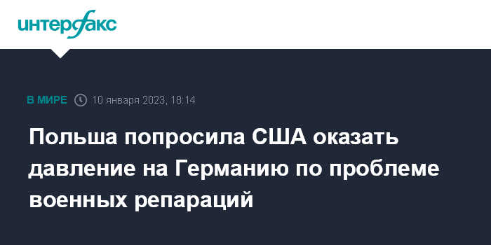 Москва. 10 января. INTERFAX.RU - Варшава обратилась к конгрессу США с призывом оказать давление на Берлин по делу о германских репарациях Польше за ущерб, нанесенный стране в годы Второй мировой войны.