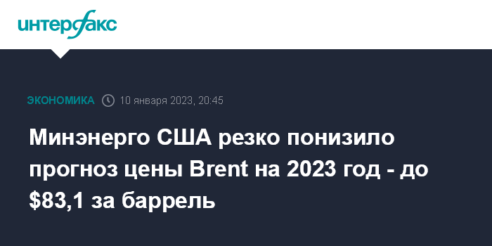 Москва. 10 января. INTERFAX.RU - Минэнерго США понизило прогноз цены нефти сорта Brent на 2023 год с $92,36/барр. до $83,1/барр., следует из данных ежемесячного прогноза управления энергетической информации ведомства (EIA).