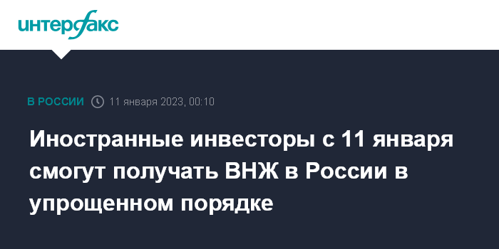 Москва. 11 января. INTERFAX.RU - Иностранные инвесторы с 11 января смогут получать вид на жительство (ВНЖ) в РФ в упрощенном порядке, соответствующее постановление правительства в среду вступает в силу.