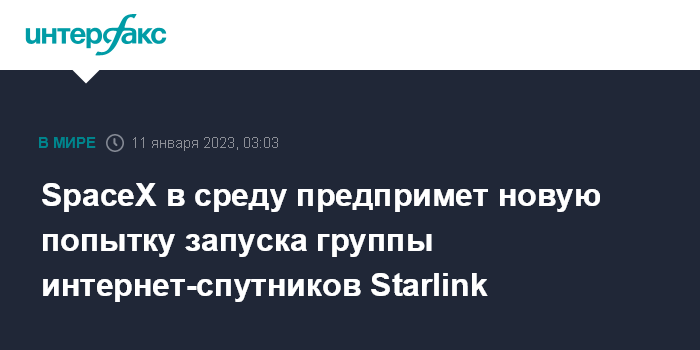 Москва. 11 января. INTERFAX.RU - Ракета-носитель Falcon 9 в среду по московскому времени должна стартовать на орбиту с очередной партией из 51 мини-спутника для пополнения орбитальной группировки глобальной сети интернет-покрытия системы Starlink, сообщает компания-разработчик SpaceX.