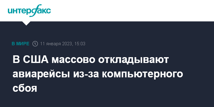 Москва. 11 января. INTERFAX.RU - В США начались массовые задержки и отмены авиарейсов из-за сбоя в компьютерной системе Федерального управления гражданской авиации (FAA). Об этом сообщает АР по ссылкой на FAA.