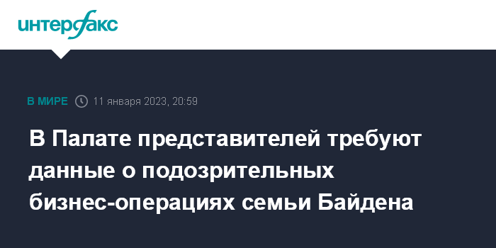 Комитет Палаты представителей США по надзору огласил планы о намерении расследовать подозрительную деловую активность семьи Байденов и ее приближенных вскоре после обнаружения в аналитическом центре имени Байдена документов, относящихся к периоду его вице-президентства. Часть этих документов имела гриф "совершенно секретно".