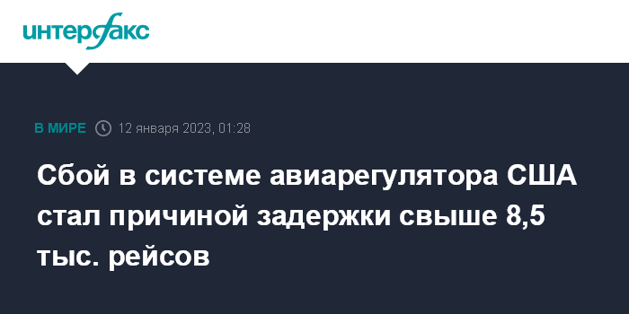Москва. 12 января. INTERFAX.RU - Технический сбой в системе оповещения пилотов федерального управления гражданской авиации США (NOTAM) привел к задержке более 8,6 тыс. рейсов и отмене более 1,2 тыс., сообщает телеканал CNN.