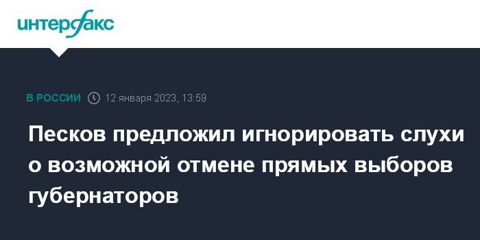 Москва. 12 января. INTERFAX.RU - В Кремле никак не реагируют на сообщения в социальных сетях о возможной отмене прямых выборов глав регионов в 2023 году ради экономии бюджетных средств, заявил пресс-секретарь президента Дмитрий Песков.