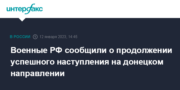 Москва. 12 января. INTERFAX.RU - Вооружённые силы России успешно наступают на донецком направлении, удары по противнику наносят авиация и артиллерия, сообщил официальный представитель министерства обороны РФ Игорь Конашенков на брифинге в четверг.
