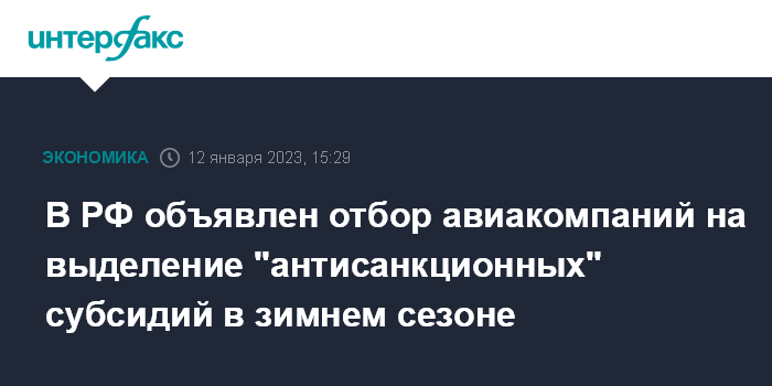 Москва. 12 января. INTERFAX.RU - Росавиация объявила отбор авиакомпаний на предоставление субсидий для поддержки полетов внутри РФ в ноябре 2022 - марте 2023 года.
