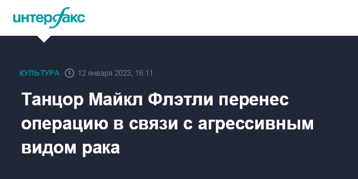 Москва. 12 января. INTERFAX.RU - Американский танцор, музыкант, хореограф и продюсер Майкл Флэтли перенес операцию в связи с агрессивным видом рака, пишет Daily Mail со ссылкой на сообщения в соцсетях артиста.