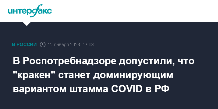 Москва. 12 января. INTERFAX.RU - Подвариант "омикрон"-штамма коронавируса XBB.1.5, или "кракен", который был выявлен в России, с большой вероятностью может стать доминирующим в России, сообщил "Интерфаксу" заведующий лабораторией геномных исследований ЦНИИ Эпидемиологии Роспотребнадзора Камиль Хафизов.
