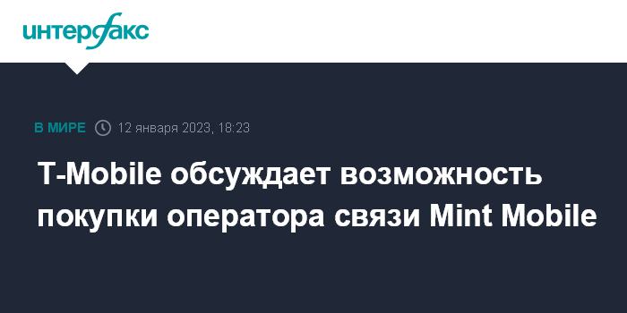 Москва. 12 января. INTERFAX.RU - Американский оператор связи T-Mobile US Inc рассматривает возможность приобретения Mint Mobile, бюджетного провайдера беспроводных услуг связи, долей в котором владеет актер Райан Рейнольдс. Об этом сообщает агентство Bloomberg со ссылкой на осведомленные источники.
