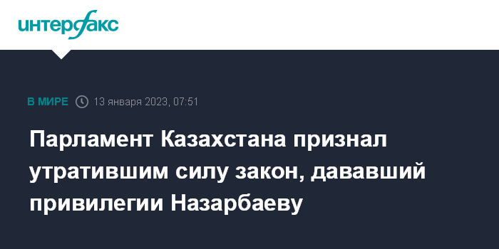 Москва. 13 января. INTERFAX.RU - В Казахстане депутаты мажилиса и сената парламента на совместном заседании палат в пятницу, рассмотрев в двух чтениях, приняли закон "О признании утратившим силу Конституционного закона Республики Казахстан "О Первом Президенте Республики Казахстан - Елбасы".
