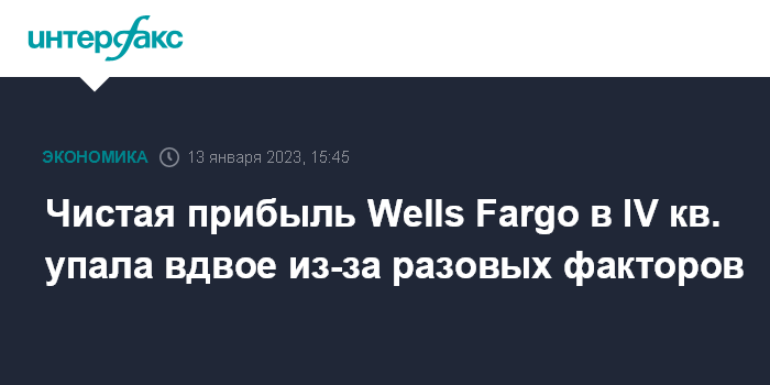 Москва. 13 января. INTERFAX.RU - Американский банк Wells Fargo & Co. зафиксировал 6%-ное снижение выручки в четвертом квартале 2022 года, а его чистая прибыль упала вдвое из-за разовых расходов.