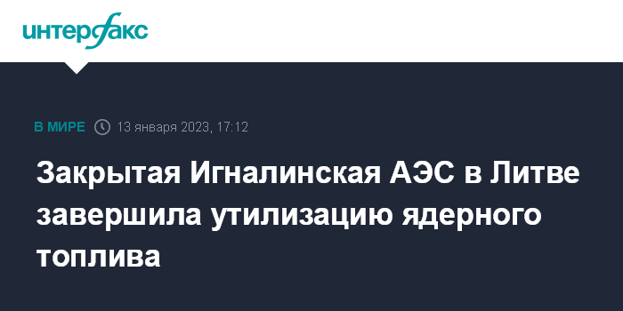 Москва. 13 января. INTERFAX.RU - Выведенная из эксплуатации Игналинская атомная электростанция (ИАЭС) в Литве утилизировала все свои использованные и неиспользованные ядерные материалы, сообщила ИАЭС.