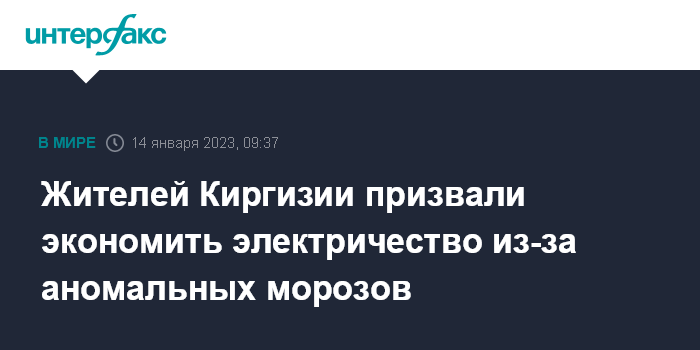 Москва. 14 января. INTERFAX.RU - Киргизские специалисты в сфере энергетики предупреждают о возможных сбоях в подаче электричества из-за наступивших в республике аномальных холодов и призывают граждан экономить электроэнергию.