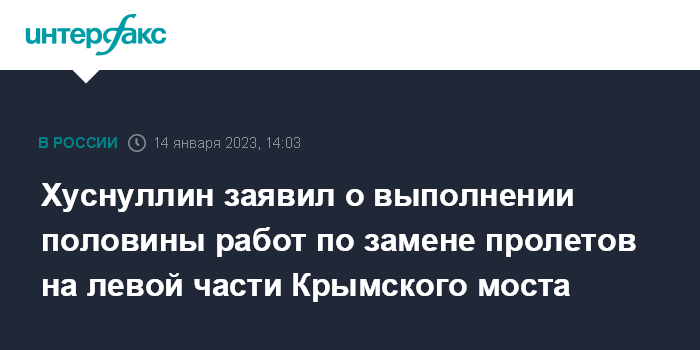 Москва. 14 января. INTERFAX.RU - Практически половина всех работ по надвижке новых пролетов левой стороны автомобильной части Крымского моста выполнена, сообщил в субботу вице-премьер РФ Марат Хуснуллин.