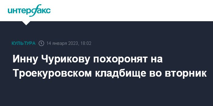 Москва. 14 января. INTERFAX.RU - Народную артистку СССР, актрису театра и кино Инну Чурикову похоронят на Троекуровском кладбище 17 января, сообщил "Интерфаксу" директор театра "Ленком Марка Захарова" Марк Варшавер.