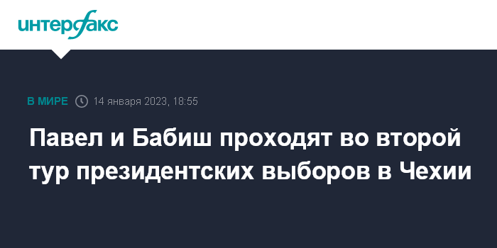 Москва. 14 января. INTERFAX.RU - Бывший премьер Чехии Андрей Бабиш и экс-председатель военного комитета НАТО Петр Павел проходят во второй тур президентских выборов, сообщает в субботу агентство EFE со ссылкой на результаты подсчета 80% бюллетеней.