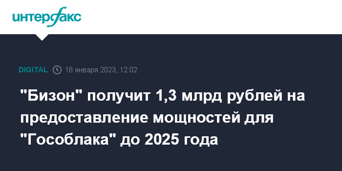 Москва. 16 января. INTERFAX.RU - Компания "Бизон" (ООО "Безопасная информационная зона", ранее входившая в структуру "Сбера") получила контракт Минцифры РФ на предоставление вычислительных ресурсов для государственной единой облачной платформы ("Гособлако") для размещения и обеспечения функционирования информсистем и ресурсов госорганов, следует из данных портала госзакупок.