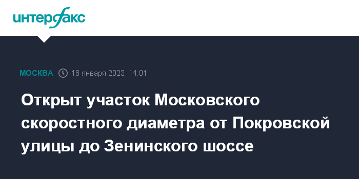 Москва. 16 января. INTERFAX.RU - Мэр Москвы Сергей Собянин в понедельник открыл расположенный за пределами МКАД участок Московского скоростного диаметра (МСД) от Покровской улицы до Зенинского шоссе.