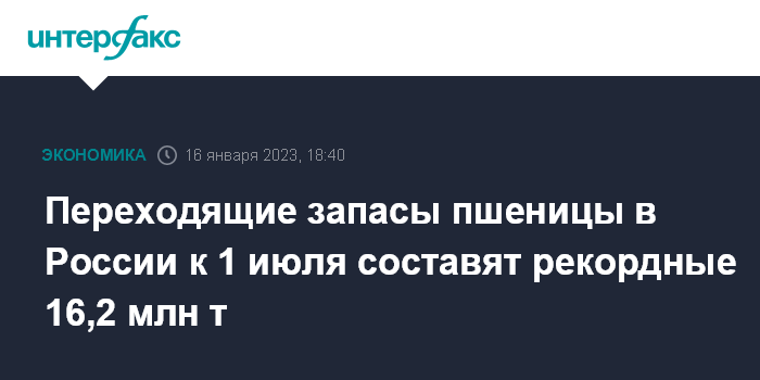 Москва. 16 января. INTERFAX.RU - Переходящие запасы пшеницы к концу текущего сельхозгода (июль 2022-июнь 2023 года) составят рекордные 16,2 млн тонн, подсчитали аналитики центра "СовЭкон".