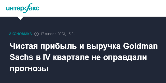 Москва. 17 января. INTERFAX.RU - Американский банк Goldman Sachs Group в четвертом квартале получил чистую прибыль и выручку хуже ожиданий.