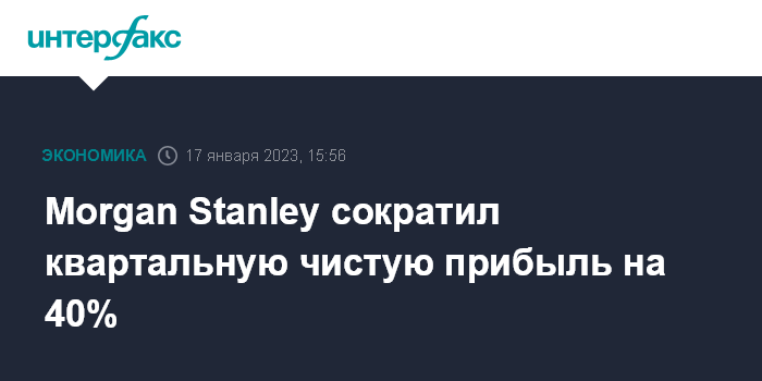 Москва. 17 января. INTERFAX.RU - В IV квартале 2022 года Morgan Stanley, один из крупнейших банков США, сократил чистую прибыль на 40%, но чистая прибыль в расчете на акцию превысила прогнозы рынка.